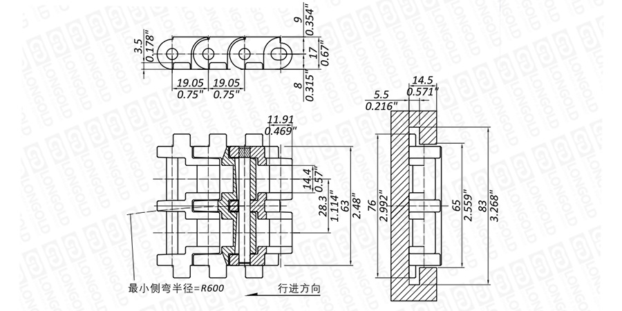 上圖為LSP-UPO12-2系列轉彎鏈的結構圖,圖紙已標明本體尺寸。