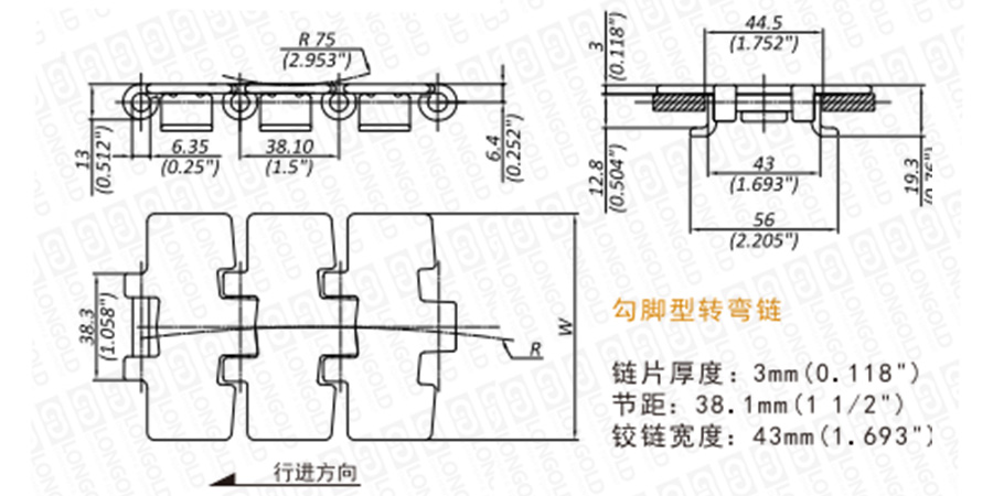 上圖為LD981T系列側(cè)彎鏈的結(jié)構(gòu)圖,圖紙已標明本體尺寸。