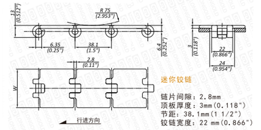 803系列直行鏈,鏈片間距為1.8毫米,鏈板細(xì)長(zhǎng),當(dāng)鏈片材質(zhì)為碳鋼時(shí),銷軸材質(zhì)為表面硬化鋼;當(dāng)鏈片材質(zhì)為不銹鋼時(shí),銷軸材質(zhì)也選用不銹鋼。