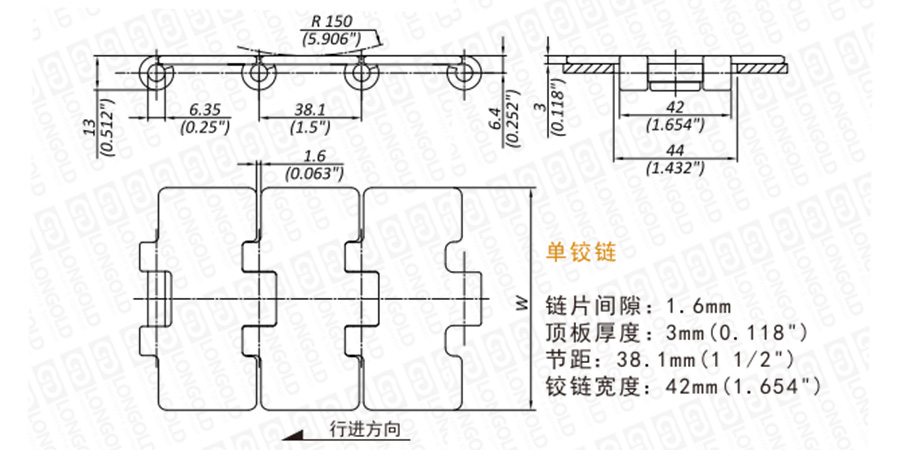 采用圓弧倒角,頂板上表面邊緣圓滑。傳送順暢、平滑,橫向和縱向間隙減小,更有利于產(chǎn)品運(yùn)作。